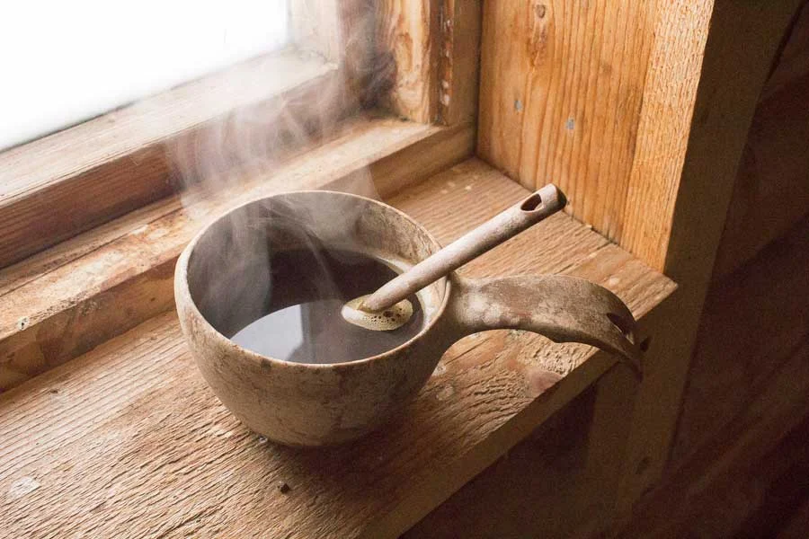 I den lilla klassiskt formade kåsan från finska Kupilka har vi hittat ett trevligt litet ämbar att sörpla vårt kokkaffe ur. Formen ska enligt tillverkaren härstamma från 1700-talet då den tjänstgjorde som kärl för att provsmaka hembränt med. Typiskt finskt säger vi!