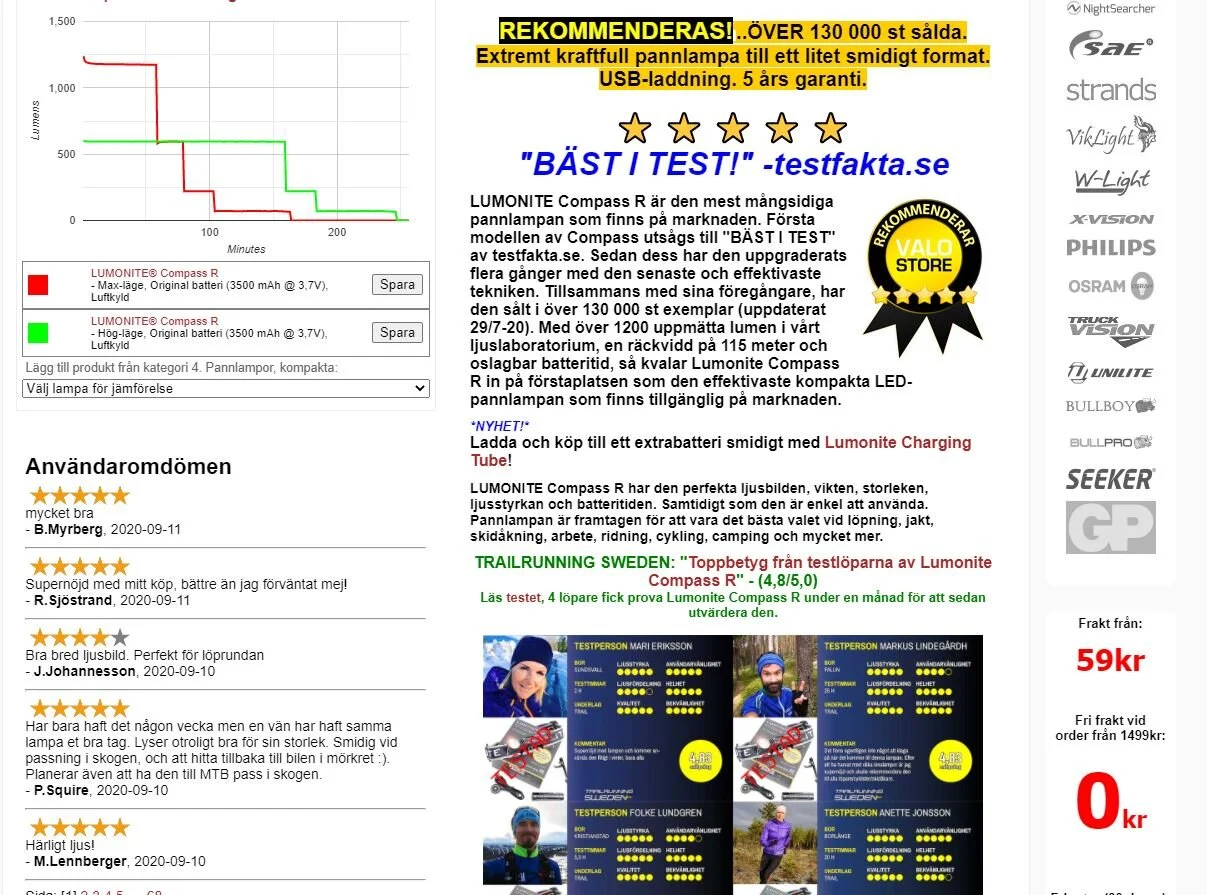 Efter en del tröskande på internet föll valet på en för mig okänd tillverkare, finska Lumonite och inköp via deras butik Valostore. Blev dock något tveksam inför köp då deras hemsida ser ut som ett annonsblad från ett lågprisvaruhus. Men när jag väl lyckades navigera bland allsköns olika typsnitt och färgad text vågade jag till sist göra ett inköp. Bakom den röriga hemsidan döljer sig faktiskt en rätt informativ beskrivning av lampans prestanda och funktioner. Compass R är nåt man skulle kunna kalla för en kompakt-pannlampa. Därmed är den kanske inte riktigt lika ljusstark som exempelvis pannlampor för professionella orienterare med separata batteripack men det kompakta formatet rymmer andra fördelar. Exempelvis ryms det uppladdningsbara och förhållandevis kraftfulla batteriet inuti det robusta och vattentäta lamphuset av anodiserad aluminium. Alltså inga sladdar som ska kopplas till ett batteri i nacken eller separat väst utan allt sitter i en smidig enhet. Faktum är att det medföljande hjässbandet är överflödigt och aldrig kommit till användning för att hålla lampan stadigt på plats.